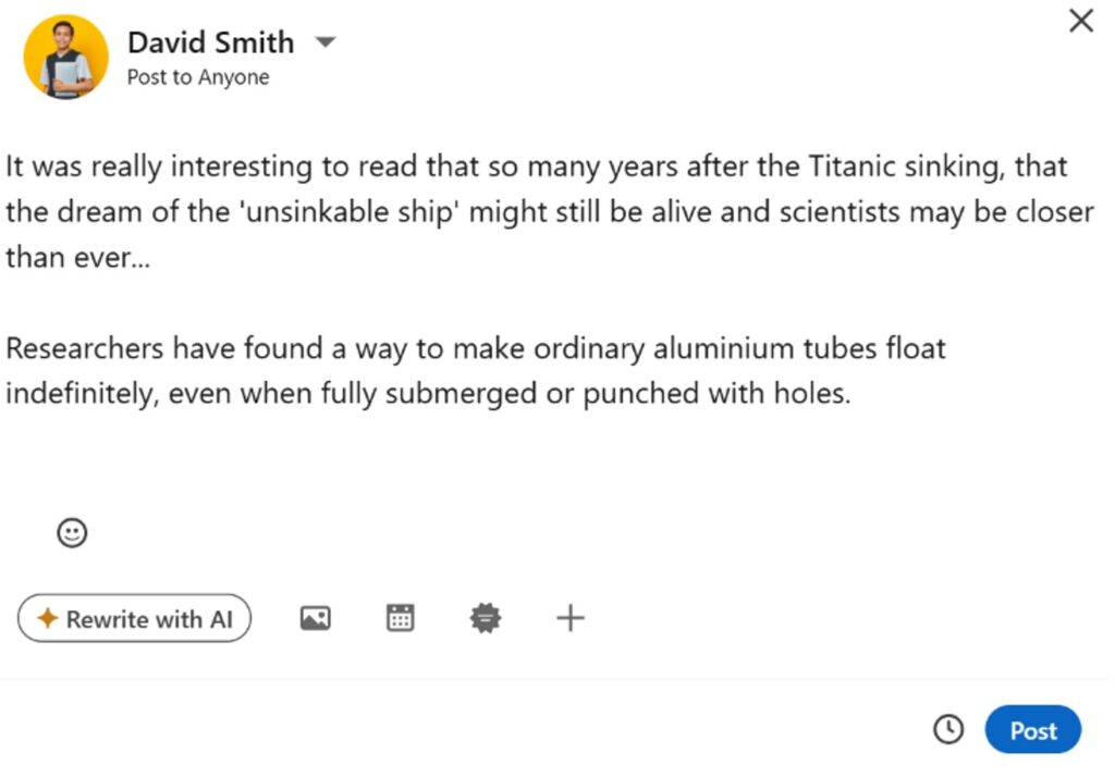 Video is one of the most engaging types of content on LinkedIn. Vertical video (like Insta reels) works best and adding captions is really important as many people watch without sound. Try to keep your video under two minutes. You could talk about something you’ve learned, an experience you’ve had or advice you’d give to someone else who is starting out in a role like yours.